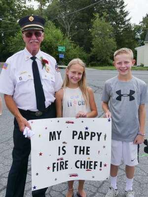 Good Will Fire Co. No. 1, Trexlertown, held its 100th anniversary parade in conjunction with the Four County Firemen's Association's 119th anniversary parade July 16. Fire Chief Arlan Wright, a 50-year member of Good Will Fire Co. No.1 was surprised by his grandchildren Corrine and Michael Cole with a sign proclaiming their Pappy as the fire chief.”PRESS PHOTO BY LOU WHEELAND