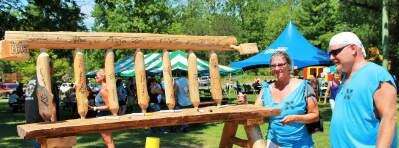 PRESS PHOTOS BY TINAMARIE MARTINDolores D'Amico and Chris Janotka, both of Northampton, sign a handmade wooden park bench in memory of Joe Sommer during a bike run and benefit, held July 24 at Tri-Boro Sportsmen Club, Route 329, Northampton. A 1985 graduate of Northampton High School, Sommer continued his Konkrete Kid pride as a wrestling coach and mentor. He was killed May 25.