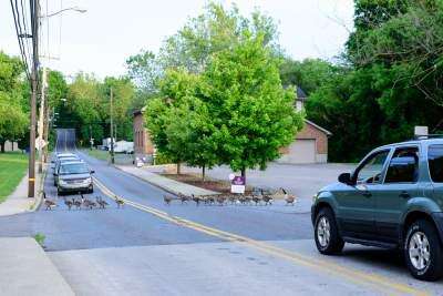 PRESS PHOTO BY SCOTT M. NAGYVehicle traffic comes to a halt on Lehigh Street, Catasauqua, as four adult geese seem to be saying to their brood, “Look both ways before crossing and stay in line!” Copyright - Scott M. Nagy