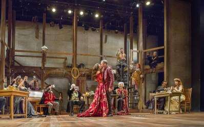 Set Designer David P. Gordon evokes a sense of Shakespeare’s Globe Theatre, with large beams and a catwalk and a sense of yard-sale chic.