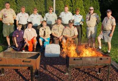 Veterans of Foreign Wars Post 4714 Honor Guard members take a group photo before pausing for a moment of silence at the June flag retirement ceremony with members of Boy Scout Troop 92 and Cub Pack 525, of Northampton, at Canal Park.PRESS PHOTOS BY AL RECKER