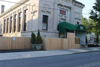 The board did not like the privacy solution implemented by the property owner. A wooden stockade fence stretches from one building to the next. At one point, it exceeds the 6-foot height limit because a set of stairs intersects the former bank building steps. The porch area on the residence hall is not enclosed.