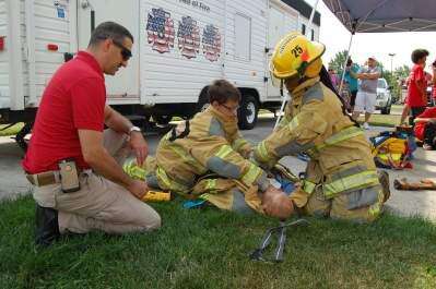 Upper Macungie Township Fire Safety Inspector Peter Christ watches as Elliot Amaya and Janae Bamba demonstrate the proper way to perform CPR at the Junior Emergency Services Academy at Upper Macungie Fire Station 56. Christ is also the New Tripoli fire chief.