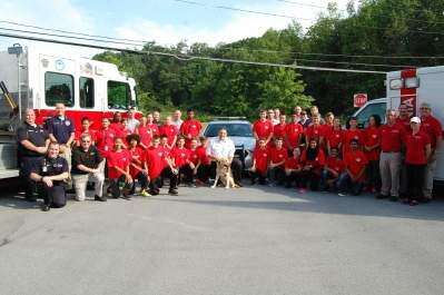 PRESS PHOTOS BY SUSAN BRYANTYouth attending the Upper Macungie Township Junior Emergency Services Academy join firefighters and police from Upper Macungie, Allentown Fire Chief Lee Laubach, with arson K-9 Judge, and personnel from Cetronia Ambulance Corps for a photo July 22 in front of Fire Station 56.