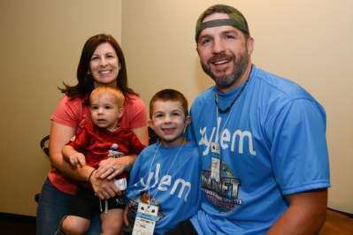 PRESS PHOTOS BY LOU WHEELANDDan Lasko, with his family, Jess, Ben and Luke, all of Hanover Township, is a key player for the Wounded Warrior Amputee Football Team. Dan Lasko lost his left leg as a result of an IED in Afghanistan in 2004. Copyright - Lou Wheeland Photography