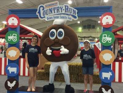 PRESS PHOTO by MARGARET FLECKSisters Hallie and Megan Niechwiadowicz of Schnecksville visit with the Whoopie Pie at the Corner Store Country Run, Lehigh University.