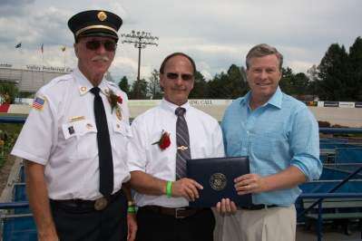 PRESS PHOTOS BY LOU WHEELANDGood Will Fire Co. No. 1, Trexlertown held its 100th anniversary parade in conjunction with the Four County Firemen's Association's 119th anniversary parade in Trexlertown, July 16. Good Will Fire Company No. 1 Chief Arlan Wright, and company President Gary Gorr join Congressman Charlie Dent, R-15th, for a photo.