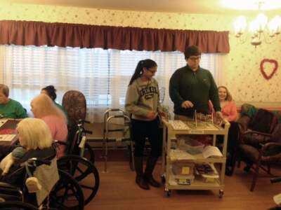 Members of Emmaus High School's Interact Club recently donated their time to help senior citizens at Mosser Nursing Home, Trexlertown, with bingo night. Interact Club members Sheena Vaidain and Jon Vose call out numbers for residents.