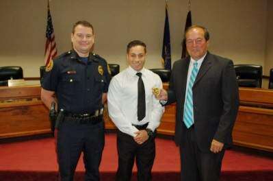 PRESS PHOTO BY AL RECKERJohnny Villanueva, 24, Whitehall Township Police Department's newest officer, is presented his badge by Mayor Edward D. Hozza Jr. at an oath of office ceremony held July 5 at the township municipal building. Also pictured is Acting Chief of Police Lt. Michael J. Marks, left. A graduate of Allentown Police Academy, Villanueva began his service immediately, riding with