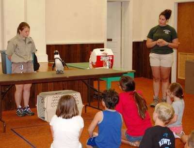 PRESS PHOTOS BY MARK RECCEKLehigh Valley Zoo conservation educator Cyndi Lansberry, left, oversees an African penguin while zoo intern Brenda Michelson discusses the habits and living habitat of the animal at the Public Library of Catasauqua's summer reading program last month.