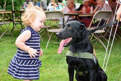PRESS PHOTO BY LOU WHEELANDMackenzie Brown, 2, checks out South Whitehall Police bomb sniffing K-9 Kimber's long tongue at the recent National Night Out event in Covered Bridge Park. The nationwide program connects local police, fire and EMS responders with the community.