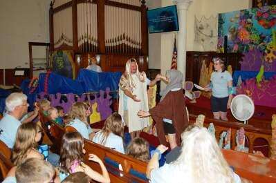Vacation Bible School at Bethany Church Tweet Published August 25. 2016 12:00AM by The Press Bethany Church Pastor Gary Dimovitz, in the role of Jesus, walks toward Peter, played by VBS volunteer Hanna, as they portray the Bible story about Jesus walking on water.