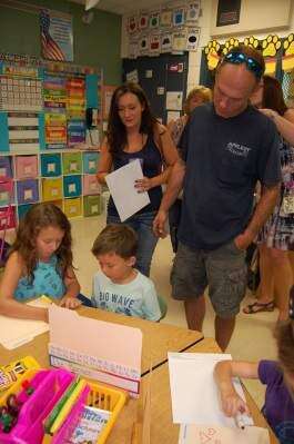 PRESS PHOTOS BY SUSAN BRYANTPaige Appleby helps her brother Carter, both of New Tripoli, decorate his folder in Krista Keys classroom during kindergarten orientation Aug. 24 at Northwestern Elementary School. Watching are their parents Sandra Bussell and Mark Appleby.