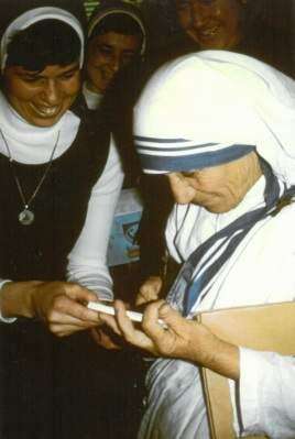 Kembel’s greeting of Mother Teresa was photographed, as was the missionary signing a book about her life for Kembel.