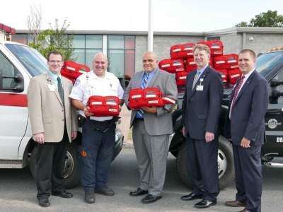 PRESS PHOTO BY LOU WHEELANDLehigh Valley Health Network's Mattioli Trauma Center provided mass casualty kits to the Cetronia Ambulance Corps to help prevent the loss of life during an extremely serious incident. John Houck, preparedness specialist at LVHN; Chris Peischl, operations manager of Cetronia Ambulance Corps; Luis Puentes, administrator of public safety and emergency operations at LVHN;