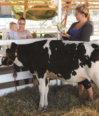 Watson's winSophia Kannapel of Breinigsville, and her daughter Desiree, 16 months, watch as Kimberly Watson, 16, of New Tripoli, applies aloe to a young Holstein named Brant at the Lehigh County 4-H Dairy Club livestock barn at the Great Allentown Fair. Brant won first place in the spring calf category.PRESS PHOTO BY ED COURRIER Copyright - &Copy; Ed Courrier