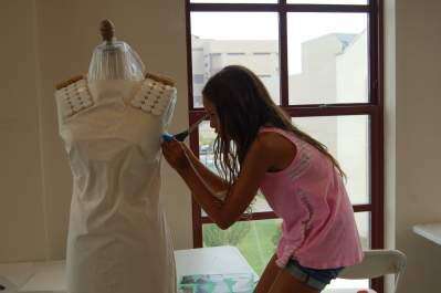 PRESS PHOTOS BY APRIL PETERSONStudents enrolled in The Fashion Academy day camp at The Baum School, Allentown, transformed into fashion designers recently, creating fashion out of such unconventional materials as tile, cork, trash bags and packing material. ABOVE: Kaya Spearko works on her sheath dress embellished with cork, tile and plastic grids. She attaches the plastic grid first, cutting it