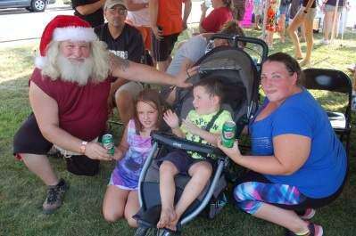 Block partyDressed as Santa, Harrison Bruder, president of West Catasauqua Fire Company, provides cold drinks on a hot afternoon to Amee Johnson and her children Meea and Christopher, of Whitehall, at the fire company's block party Sept. 10.PRESS PHOTO BY AL RECKER