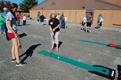 Parkland High School basketball team member Keeley Coval watches as June Elliott of Coplay plays miniature golf Sept. 15 at Senior Citizen Day at the Schnecksville Fire Company. The event was sponsored by state Rep. Gary Day, R-187th, and state Sen. Pat Browne, R-16th.PRESS PHOTO BY SUSAN BRYANT