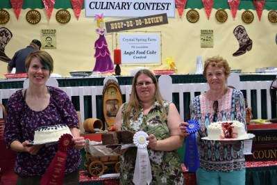 PRESS PHOTO BY JENNIFER BODISCHPam Stettler, of Schnecksville, takes the first place and the blue ribbon in the PA Incredible Angel Food Cake competition sponsored by Crystal Springs Farm at The Great Allentown Fair recently. ABOVE: Grace Sell, far right, accepts the award for Stettler and holds the winning entry. Abby Stalsitz, of Salisbury Township, far left, places second. Ruby Jones, of Emmaus