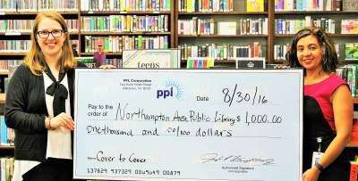 PRESS PHOTO BY TINAMARIE MARTINCarol Obando-Derstine, right, PPL Electric Utilities regional affairs director, presents a $1,000 grant from PPL Foundation to Susan Sentz, director of Northampton Area Public Library, during a ceremony Aug. 30. The grant funded the library's summer reading program for children and teens.