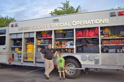 Capt. Shawn Burrows of Lehigh County Special Operations shows Kernsville fifth grader Blayne Yocum the supplies and equipment stocked in the huge truck. The unit consists of approximately 30 members trained to respond to special emergency situations and rescues such as structural collapses, confined spaces and trench rescues.PRESS PHOTOS BY JENNIFER BODISCH