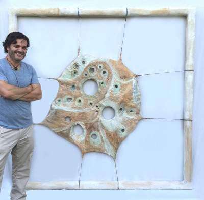 “The Sacred Gate” (78 in. x 78 in.) is a square mixed media work. Gaps and spaces resemble amoebas. Circles and waves within the piece give the appearance of movement.