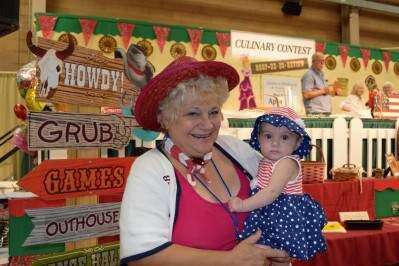 PRESS PHOTO BY JENNIFER BODISCHJulie Intrepido-Kmetz, of Nazareth, superintendent of the culinary stage at the 164th Great Allentown Fair for 17 years, gets a little help Sept. 5 from her 8-month-old granddaughter, Sarah Grace Welser. A resident of Catasauqua, Sara Grace came dressed for Labor Day.