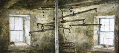 Moody barn interiors and landscapes offer stark contrast on opposing walls.