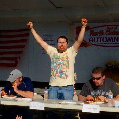 PRESS PHOTOS BY MARK RECCEKDavid Taylor, also known as “The Gator,” raises his hands in victory after eating his fifth halupki. Taylor, an Allentown resident, was declared the halupki-eating contest winner at Sunday's North Catasauqua Autumnfest & Car Show. He was awarded $100 after downing five halupkies before the other eight contestants.