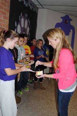 PRESS PHOTOS BY SUSAN BRYANTNorthwestern Middle School teacher Kristen Xander paints sixth-grader Elizabeth Drake's hand with dark purple paint Sept. 30 as fellow classmates Nina Miller, Lydia Lobach, Tom Tenzychi, Alexah Lloyd, Jacob Solt, Wyatt Newhard and Ben Fornwalt wait their turn to have their hand painted so they can leave their handprint on the middle school wall.