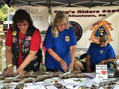 From left, Gina Gabriel, of Coplay, and Mary and Roger Schwenk, of Emmaus, prepare their stand for riders of the 17th annual Rally Through the Valley Poker Run and Pig Roast. The event is a premier motorcycle rally to benefit Crime Victims Council of the Lehigh Valley. The ride begins at Nazareth Borough Park and continues on a 60-mile course before ending at Emmaus Community Park. The event