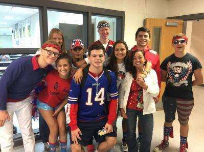 PRESS PHOTOS BY NICHOLAS TOTOWilliam Newbegin, Hannah Maron, Justin Chandler, Nick Cilento, Joelle Gantert, Matt Swanson, Elijah Stark, Rachel Allmandinger, Morgan Tietz and Mrs. Denise Fruwirth dress in their American Spirit clothing for America Day Oct. 3 at Emmaus High School.
