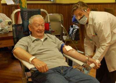 Don Regan, of Northampton, who has been a blood donor for most of his adult life, donates blood at a Miller-Keystone Blood Center drive, held Sept. 24 in Ruffenach Hall at St. John the Baptist Church, Stiles. Kris Artiaga performs the task of drawing blood.PRESS PHOTO BY AL RECKER