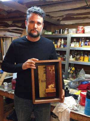 Artist Domenick Naccarato uses pieces of wood, hardware, wire, twine and a few nails in his art work. Then he applies non-traditional finishes of wood stains, house paint, joint compound and roofing tar.