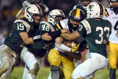 PRESS PHOTO BY NANCY SCHOLZ The Emmaus defense, seen here in a game against Freedom, came up with what could be the biggest stop in program history when it held Parkland on a fourth and one in overtime Friday night to secure the Eastern Pennsylvania Conference title.