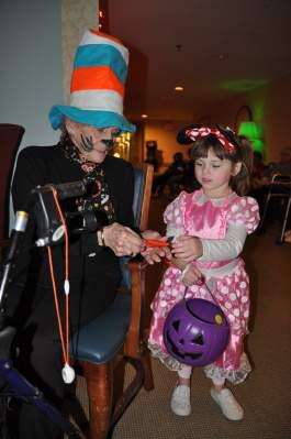 PRESS PHOTO BY JIM MARSHLaycee Duffy, of Macungie, is among young trick or treaters whose parents took them to the DevonHouse senior living facility for a “safe candy” giveaway recently. Resident Jan Medencee joins in the festivities by dressing as a famous storybook cat.