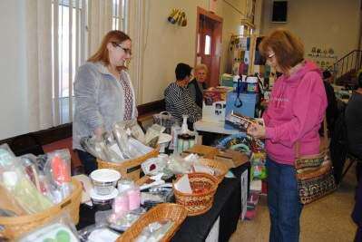 PRESS PHOTOS BY SUSAN BRYANTLisa Montanye of Pampered Chef, Allentown, talks with Sheryl Hunt of South Whitehall as she looks through one of her catalogs Nov. 5 at the fall bazaar at Woodlawn Fire Company, South Whitehall.