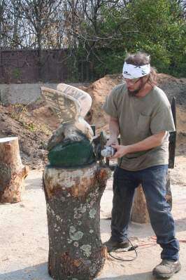 PRESS PHOTO BY DEBRA PALMIERIWood carver Dave Robinson of Tennessee crafts an American bald eagle from a piece of wood using a chain saw during the recent woodworkers fair at Bailey Wood Products, Kempton. Robinson is also known as Brother Bear.
