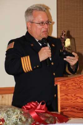 PRESS PHOTOS BY DENNIS WETHERHOLD JR.Above: Filled with emotion, Whitehall Fire Department Deputy Chief Joseph Shambo accepts the first-ever Robert L. Benner Award during the annual fire department banquet Nov. 6. The award for excellence was given in memory of the late Fire Chief Robert L. Benner, who served the department for more than 40 years. Later in the evening, Shambo also received an