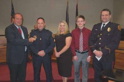 PRESS PHOTO BY AL RECKERWhitehall Township Mayor Edward D. Hozza Jr. places a sergeant's pin on the uniform of Officer Jeffrey Coleman, who was promoted from corporal and recognized during a ceremony at the Oct. 10 board of commissioners meeting. Also pictured are Coleman's wife, Valerie; stepson, Matthew; and Police Chief Michael Marks.