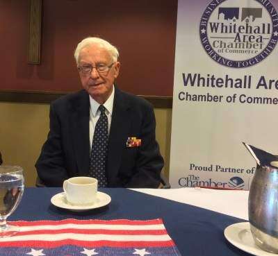 PRESS PHOTOS BY MARK RECCEKWhitehall resident Matt Guttman was guest speaker at this year's Whitehall Area Chamber of Commerce Veterans Day luncheon Nov. 10. Guttman, a World War II veteran, served 22 years in the U.S. Navy.