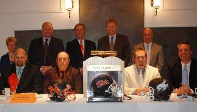 PRESS PHOTO BY AL RECKERSpecial guests at the 69th annual Bury the Hatchet dinner program, held Nov. 22 at Northampton Banquet & Event Center, gather for a photo before the big game on Thanksgiving. Pictured are, seated, from left, Shaun Murray, Northampton Area High School athletic director; Mark Scisly, Northampton Konkrete Kids head football coach; Phil Dorn, Catasauqua Rough Riders head