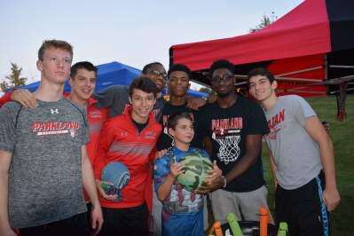 PRESS PHOTO BY JENNIFER BODISHCaptain America, a.k.a. Trent Ware, of Catasauqua, gets a slam dunk with the help of some volunteers who are members of the Parkland High School basketball team. With Trent, who is standing in front, are, from left, Jake Bartholomew, Tyler German, Zach Standel, Kiaeem Comegys, Josiah Felix, Deven Ross and Michael Gombos.