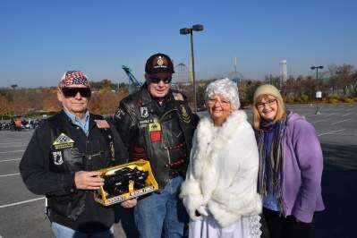 PRESS PHOTO BY JENNIFER BODISCHWhile awaiting Santa's arrival, Mrs. Claus, along with two members of the Lehigh Valley Chapter of Alliance of Bikers Aimed Toward Education (ABATE), Pat Costas and Dick Deibert, present gifts and donations to Sharon McCarthy, director of communications at Turning Point. The presents will go to children at the Lehigh Valley's only safe house for domestic violence