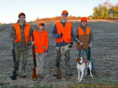 PRESS PHOTOS BY LOU WHEELANDCole Kaminski, 14, of Kutztown; Robbie Schramel, 13, of Slatedale; Nicholas Kern, 14, of Schnecksville; Broc Bender, 12, of Whitehall; were the first four to hunt at the recent youth pheasant hunt at Grouse Hall Fish and Game Club, Coplay. “Fannie,” a Brittany spaniel bird dog joined the hunt.