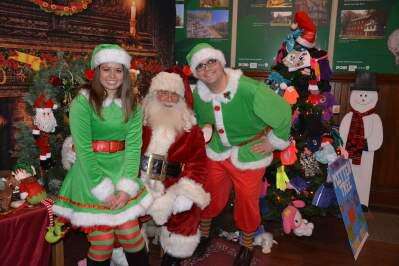 Giving Santa a hug at the Jim Thorpe Train Station are elves Marie Mikols of Germansville and Tom Hudak of Orefield. Santa is assisted by Bob Eulo of Jim Thorpe. His visit is in conjunction with the borough's Olde-Time Christmas celebration during the first three weekends of December.PRESS PHOTOs BY RON GOWER