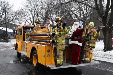 PRESS PHOTOS BY JIM MARSHBecause of inclement weather Dec. 17, volunteers at Western Salisbury Volunteer Fire Department enlisted both Santa and Santa's helper for the department's traditional five-hour Santa run on fire engines through neighborhoods in the western fire district. For safety's sake, the Santa run was split into two shorter runs to reach all the neighbors traditionally visited.