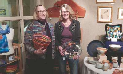 Margaret DeCook, left, with her display of fabric art and fabric wrapped bowls, and Nanette Wallis, right, holding a fused glass “Koi Fish in a Bowl” she created, are among 50 regional artists invited to participate in this year's “Holiday Gift Gallery,” through Dec. 22, The Baum School of Art, 510 W. Linden St., Allentown, according to Kristine Kotsch, Baum director of exhibitions and collections Copyright - &Copy; Ed Courrier