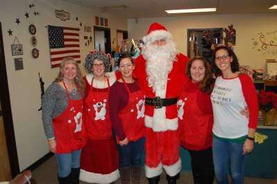 Santa, Mrs. Claus and Sheckler Home and School Association volunteers get together before heading down the halls of the elementary school to visit students in their classrooms Dec. 21. From left, with Mrs. Claus and Santa, are HSA board members Kelly Rizzo, Heather Fehr, Julia Larkin and Heather Walp.Press photos by Mark Reccek